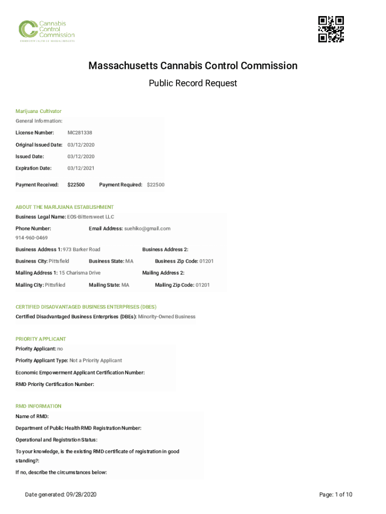 Massachusetts Cannabis Control Commission Public Record Request Marijuana Cultivator General Information: License Number:MC281338Original Issued Date: 03/12/2020 Issued Date:03/12/2020Expiration Date:03/12/2021Payment