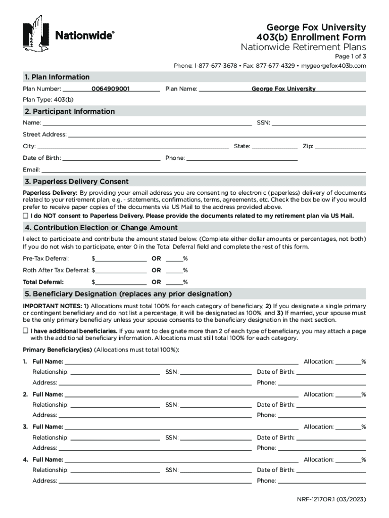 George Fox University 403(b) Enrollment Form Nationwide Retirement Plans Page 1 of 3 Phones: 18776773678 Fax: 8776774329 mygeorgefox403b.com1. Plan Information Plan Number:0064909001Plan Name:George