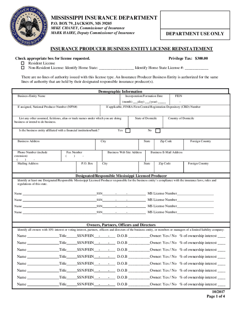 MISSISSIPPI INSURANCE DEPARTMENT P.O. BOX 79, JACKSON, MS 39205 MIKE CHANEY, Commissioner of Insurance MARK HAIR, Deputy Commissioner of InsuranceDEPARTMENT USE ONLYINSURANCE PRODUCER BUSINESS ENTITY