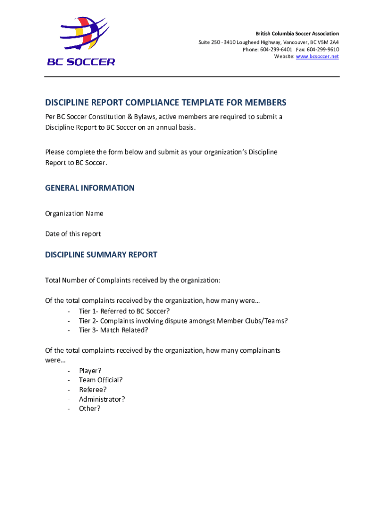 British Columbia Soccer Association Suite 250 3410 Lockheed Highway, Vancouver, BC V5M 2A4 Phone: 6042996401 Fax: 6042999610 Website: www.bcsoccer.netDISCIPLINE REPORT COMPLIANCE TEMPLATE FOR MEMBERS