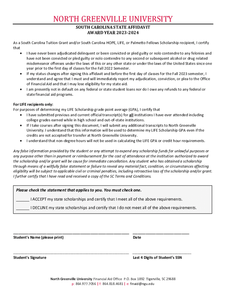NORTH GREENVILLE UNIVERSITY SOUTH CAROLINA STATE AFFIDAVIT AWARD YEAR 20232024 As a South Carolina Tuition Grant and/or South Carolina HOPE, LIFE, or Palmetto Fellows Scholarship recipient, I certify