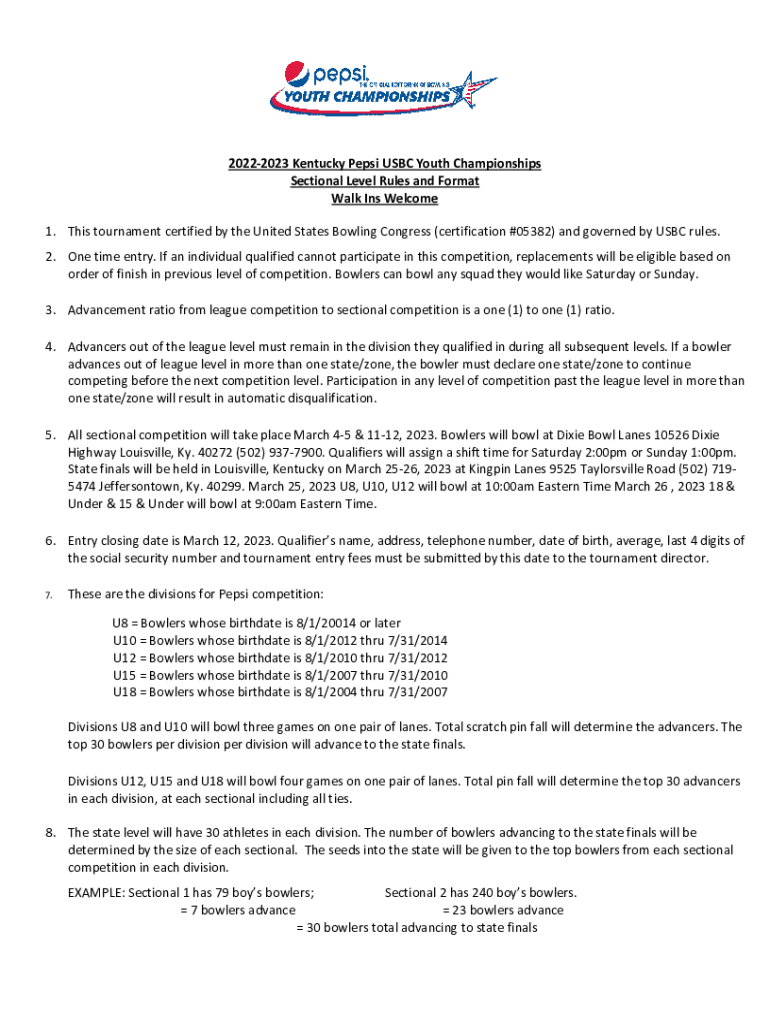 20222023 Kentucky Pepsi USB Youth Championships Sectional Level Rules and Format Walk Ins Welcome 1. This tournament certified by the United States Bowling Congress (certification #05382) and governed