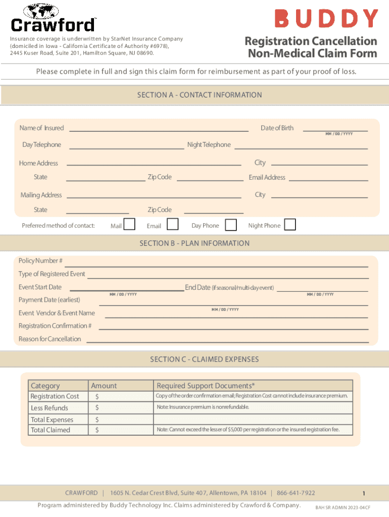 Get the free Registration Cancellation Medical Claim Form - Buddy Insurance