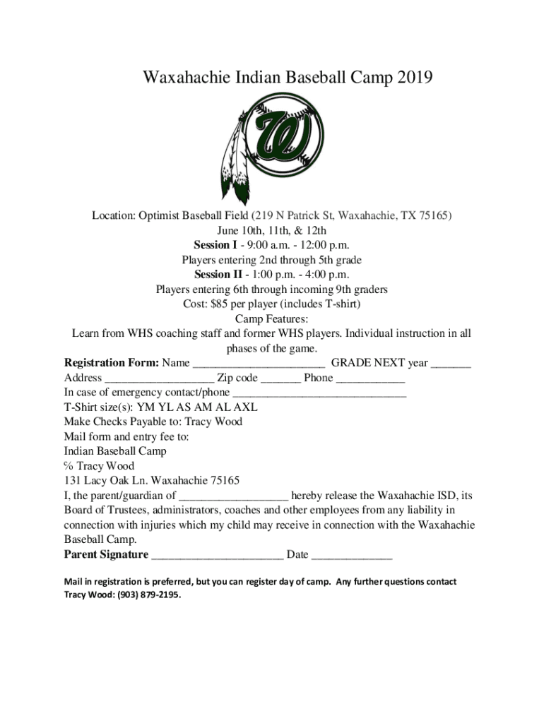 Waxahachie Indian Baseball Camp 2019Location: Optimist Baseball Field (219 N Patrick St, Waxahachie, TX 75165) June 10th, 11th, & 12th Session I 9:00 a.m. 12:00 p.m. Players entering 2nd through 5th