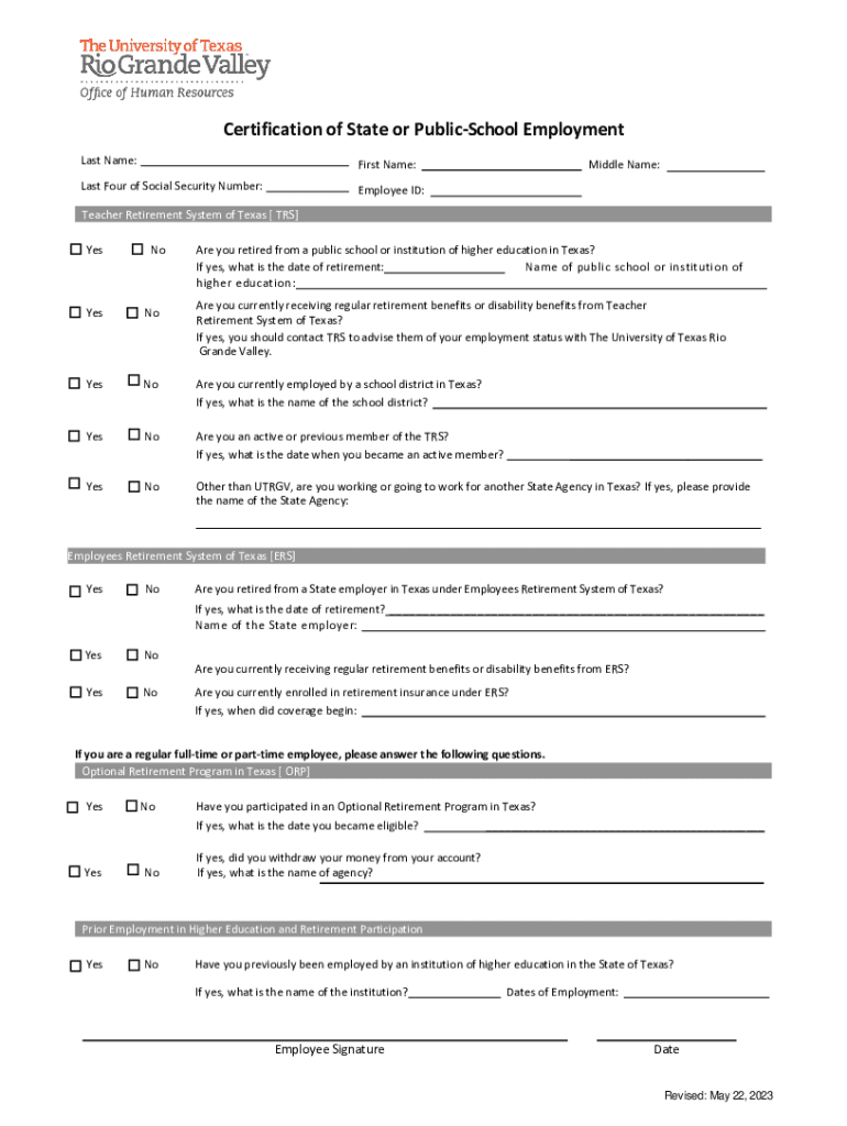 Certification of State or PublicSchool Employment Last Name:First Name:Last Four of Social Security Number:Employee ID:Middle Name:Teacher Retirement System of Texas [TRS] Restore you retired from