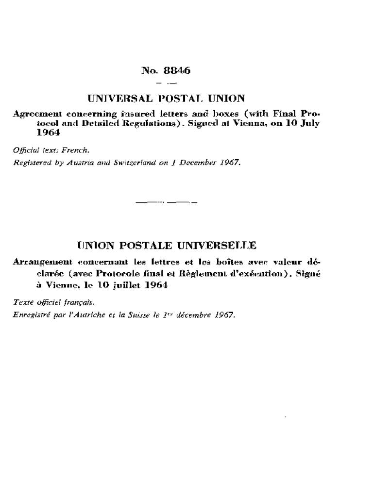 No. 8846 UNIVERSAL POSTAL UNION Agreement concerning insured letters and boxes (with Final Pro tool and Detailed Regulations). Signed at Vienna, on 10 July 1964 Official text: French. Registered by