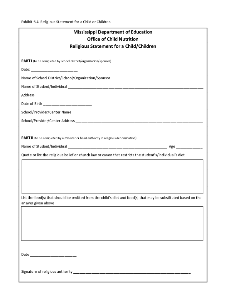 Exhibit 6.4. Religious Statement for a Child or Children Mississippi Department of Education Office of Child Nutrition Religious Statement for a Child/Children PART I (to be completed by school district/organization/sponsor)