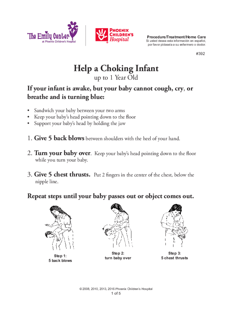 Procedure/Treatment/Home Cars used DESE ESTA information en Español, POR favor Pamela a SU enforcer o doctor.#392Help a Choking Infant up to 1 Year Oldie your infant is awake, but your baby cannot