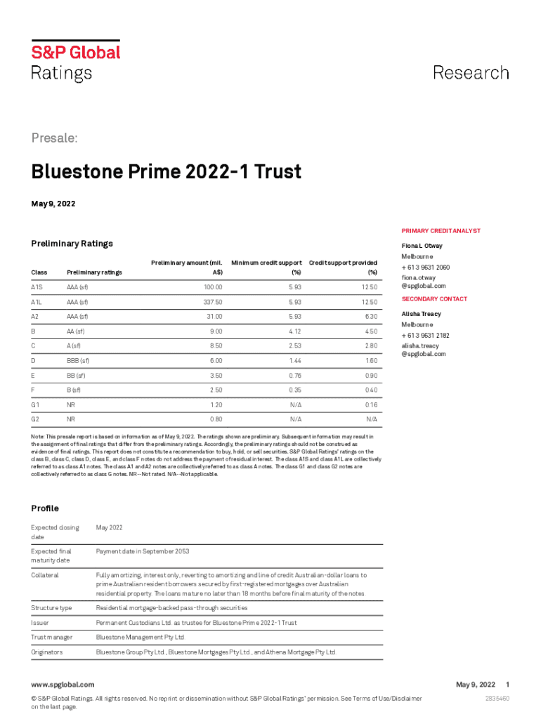 Presale:Blue stone Prime 20221 Trust May 9, 2022, PRIMARY CREDIT ANALYSTPreliminary Ratings Fiona L Away Preliminary amount (mil. A)Minimum credit support (%)Credit support provided (%)Melbourne +