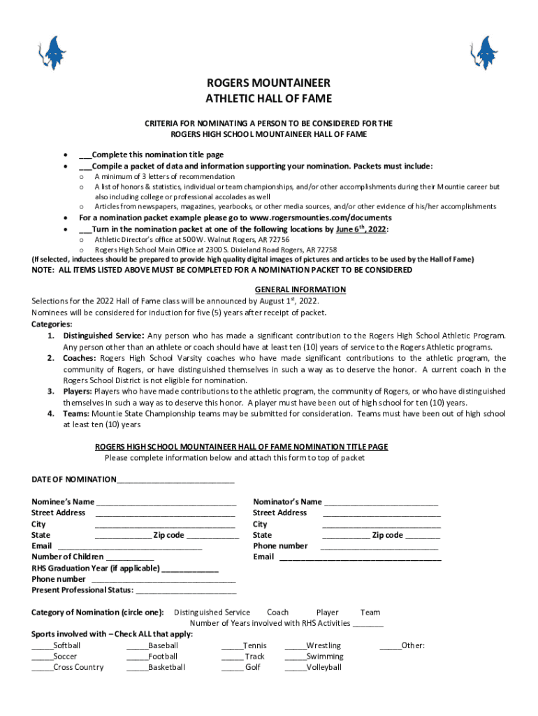 ROGERS MOUNTAINEER ATHLETIC HALL OF FAME CRITERIA FOR NOMINATING A PERSON TO BE CONSIDERED FOR THE ROGERS HIGH SCHOOL MOUNTAINEER HALL OF FAME ___Complete this nomination title page ___Compile a packet