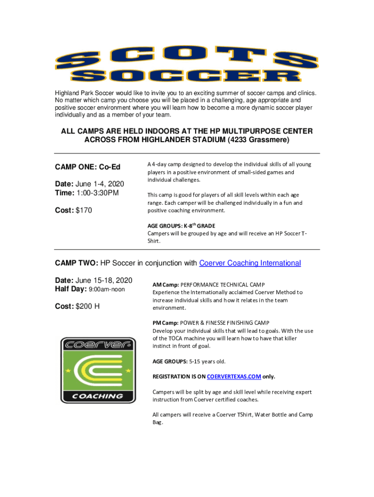 Highland Park Soccer would like to invite you to an exciting summer of soccer camps and clinics. No matter which camp you choose you will be placed in a challenging, age appropriate and positive soccer