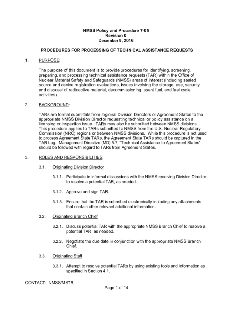 MSS Policy and Procedure 705 Revision 0 December 9, 2016, PROCEDURES FOR PROCESSING OF TECHNICAL ASSISTANCE REQUESTS 1.PURPOSE: The purpose of this document is to provide procedures for identifying,