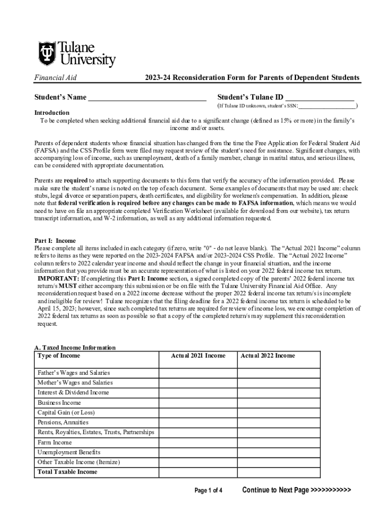 Financial Aid202324 Reconsideration Form for Parents of Dependent StudentsStudents Name ___Students Tulane ID ___(If Tulane ID unknown, students SSN:___)Introduction To be completed when seeking additional