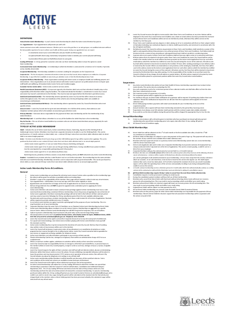 27.DEFINITIONS Annual Active Leeds Membership A year\'s Active Leeds Membership for which the Active Leeds Member has paid in28.full. Appointment Gym Appointments will provide you with a 60-minute