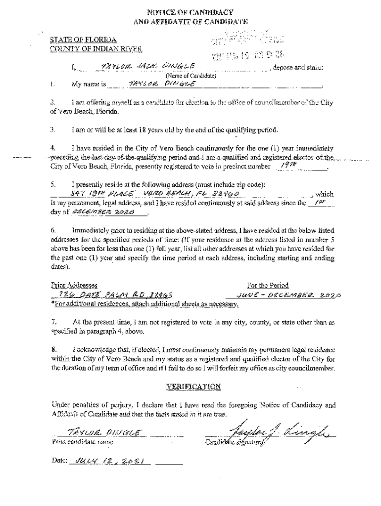 NOTICE OF CANDIDACY AND AFFIDAVIT OF CANDIDATE.STATE OF FLORIDA COUNTY OF INDIAN RIVER Cf, 0;, \”;,t281M_\'G_t_6\' I, ?. A_\'A_YT’d/2.__.;:r, _\” 4i_?._.ll__0:_ _ _ _ _ depose and state:(Name