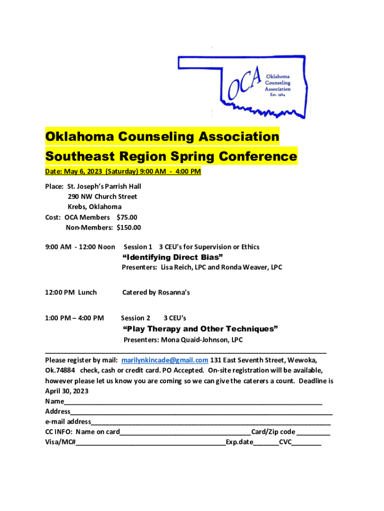 Oklahoma Counseling Association Southeast Region Spring Conference Date: May 6, 2023 (Saturday) 9:00 AM 4:00 PM Place: St. Josephs Parrish Hall 290 NW Church Street Krebs, Oklahoma Cost: OCT Members