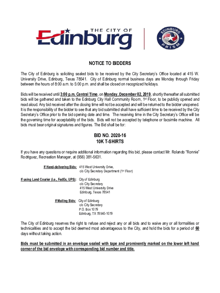 NOTICE TO BIDDERS The City of Edinburg is soliciting sealed bids to be received by the City Secretary's Office located at 415 W. University Drive, Edinburg, Texas 78541. City of Edinburg normal business