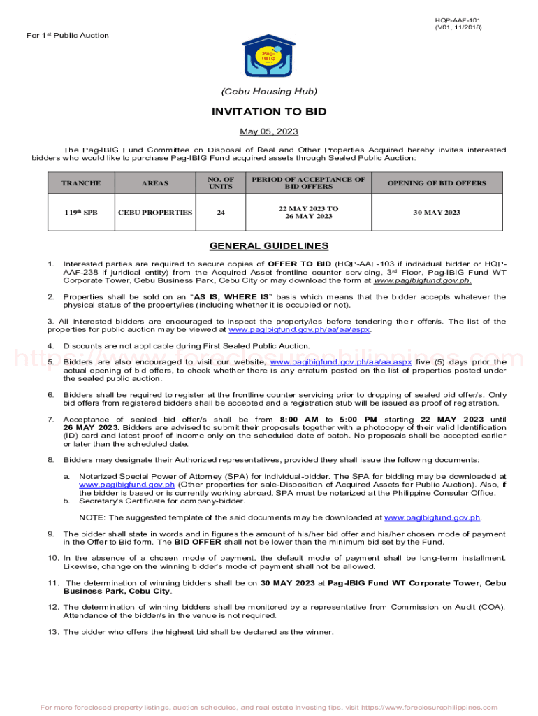 HQPAAF101 (V01, 11/2018)For 1st Public Auction(Cebu Housing Hub)INVITATION TO BID May 05, 2023, The Paging Fund Committee on Disposal of Real and Other Properties Acquired hereby invites interested