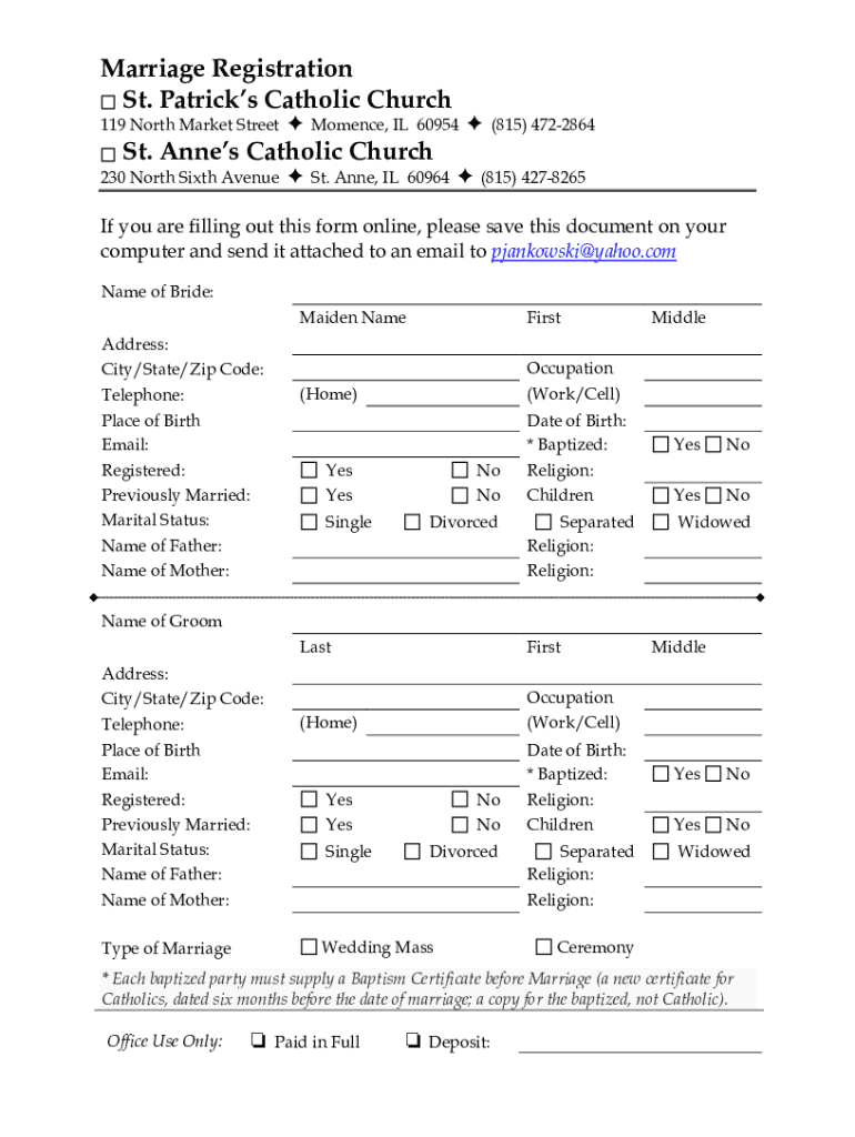 Marriage Registration St. Patrick's Catholic Church119 North Market Street F Moment, IL 60954 F (815) 4722864St. Anne's Catholic Church230 North Sixth Avenue F St. Anne, IL 60964 F (815) 4278265If