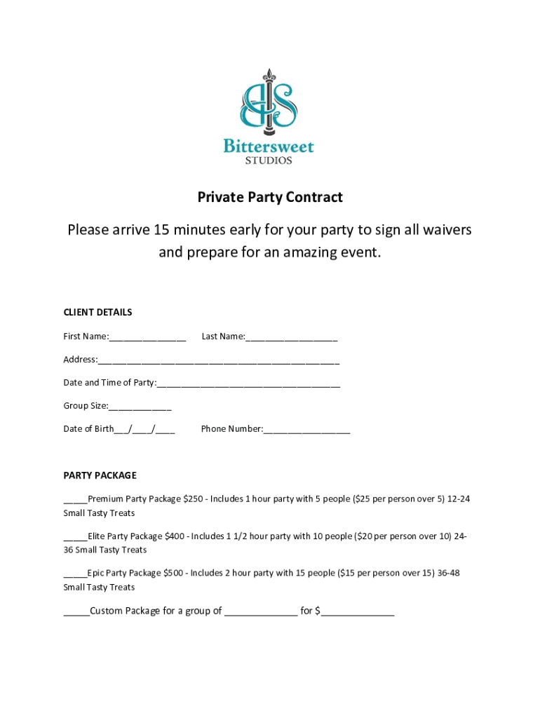 Private Party Contract Please arrive 15 minutes early for your party to sign all waivers and prepare for an amazing event. CLIENT DETAILS First Name:___Last Name:___Address:___ Date and Time of Party:___