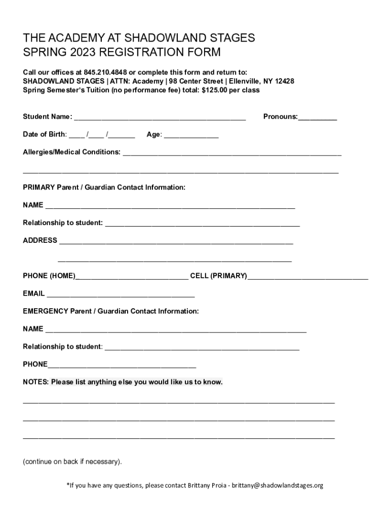 THE ACADEMY AT MEADOWLAND STAGES SPRING 2023 REGISTRATION FORM Call our offices at 845.210.4848 or complete this form and return to: MEADOWLAND STAGES | ATTN: Academy | 98 Center Street | Belleville,
