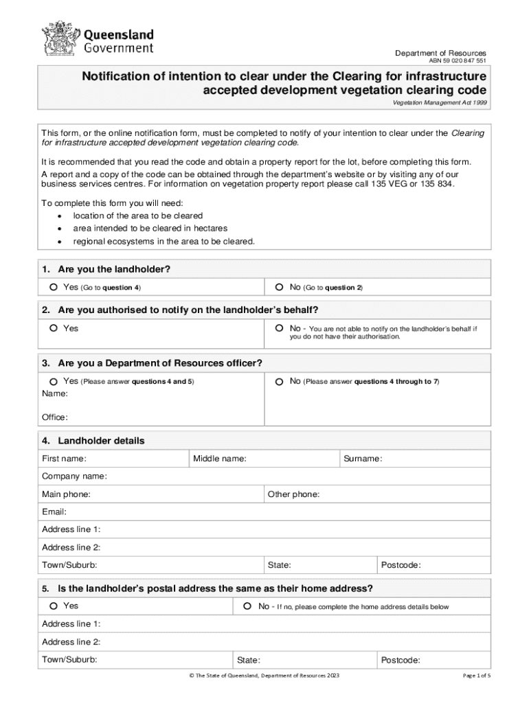 Department of Resources ABN 59 020 847 551Notification of intention to clear under the Clearing for infrastructure accepted development vegetation clearing code Vegetation Management Act 1999This