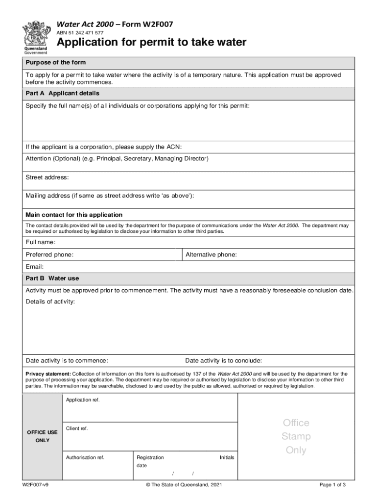 Water Act 2000 Form W2F007 ABN 51 242 471 577Application for permit taking water Purpose of the form To apply for a permit to take water where the activity is of a temporary nature. This application