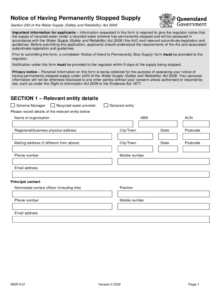 Notice of Having Permanently Stopped Supply Section 230 of the Water Supply (Safety and Reliability) Act 2008 Important information for applicants Information requested in this form is required to
