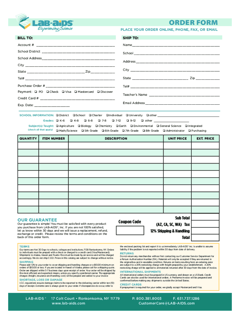 ORDER FORM PLACE YOUR ORDER ONLINE, PHONE, FAX, OR EMAIL BILL TO:SHIP TO:Account # ___Name ___School District ___School ___School Address ___Address ___City ___City ___State ___Zip ___ Tel# ___State