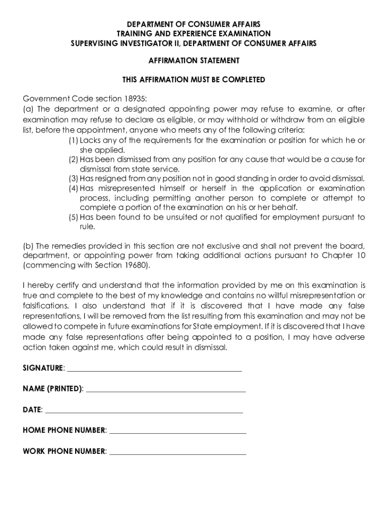 SUPERVISING INVESTIGATOR II, DEPARTMENT OF CONSUMER AFFAIRS Examination Code: 9CABB Department: Department of Consumer Affairs (DCA) Examination Type: Departmental Open Final Filing Date: Continuous