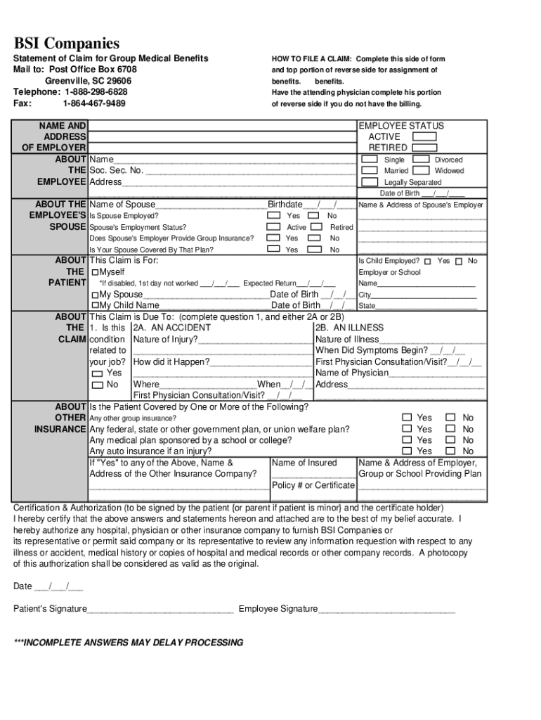 BSI Companies Statement of Claim for Group Medical Benefits Mail to: Post Office Box 6708 Greenville, SC 29606 Telephone: 18882986828 Fax: 18644679489HOW TO FILE A CLAIM: Complete this side of form
