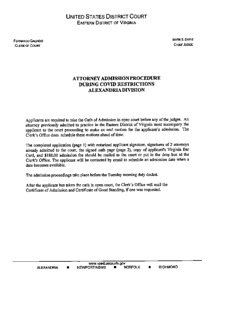 Eastern District of Virginia Fernando GalindoClerk OF Courtier JudgeATTORNEY ADMISSION PROCEDURE