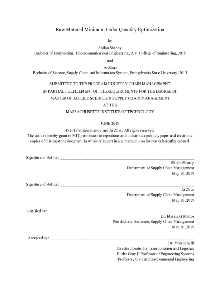 Raw Material Minimum Order Quantity Optimization by Ships Henry Bachelor of Engineering, Telecommunications Engineering, R.V. College of Engineering, 2015 and Ai Zhao Bachelor of Science, Supply Chain