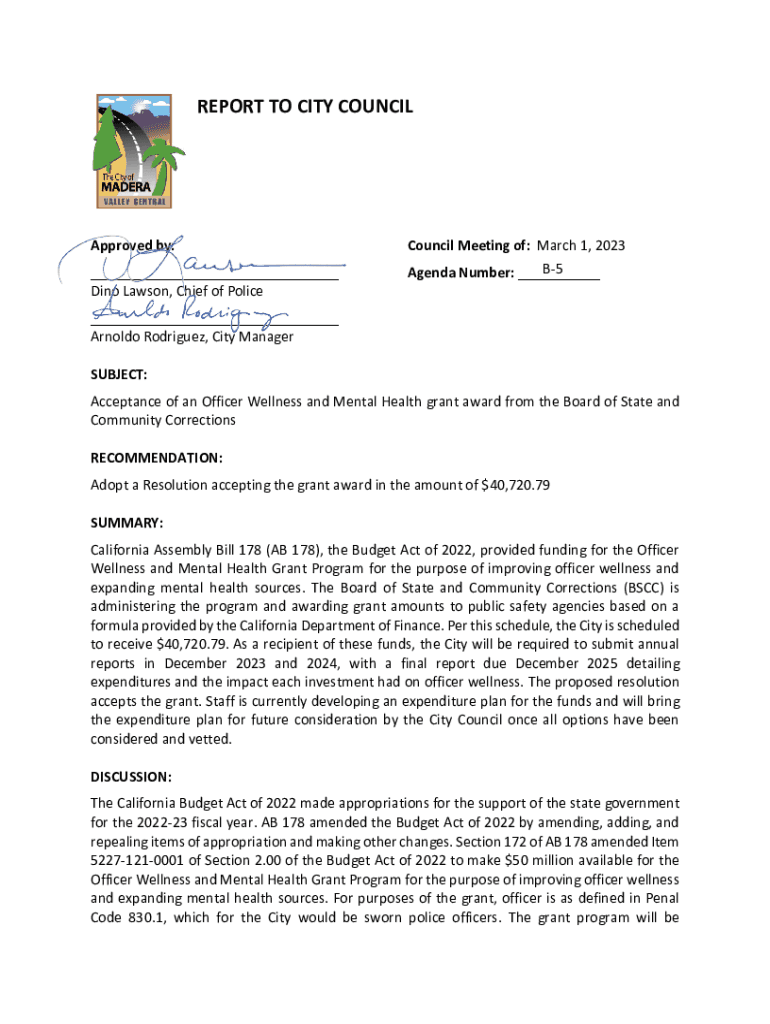 Get the free Acceptance of an Officer Wellness and Mental Health grant award from the Board of St...