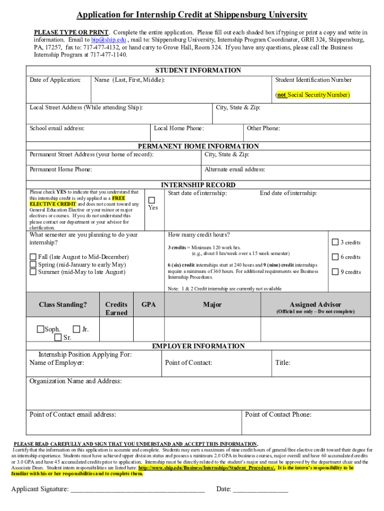 Application for Internship Credit at Shippensburg University PLEASE TYPE OR PRINT. Complete the entire application. Please fill out each shaded box if typing or print a copy and write in information.
