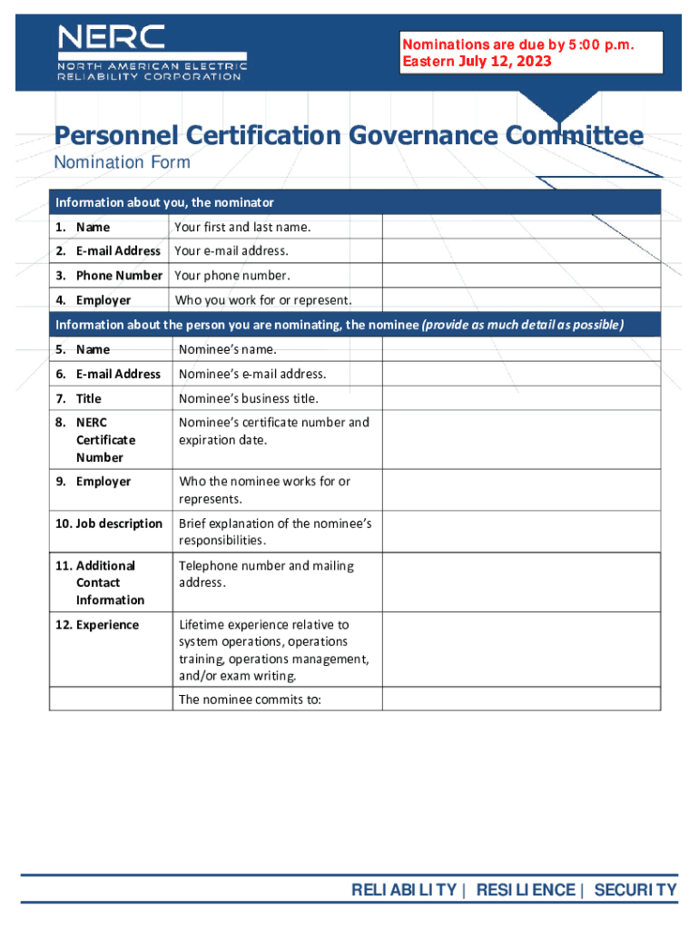 Eastern July 12, 2023Personnel Certification Governance CommitteeNomination FormInformation about you, the nominator