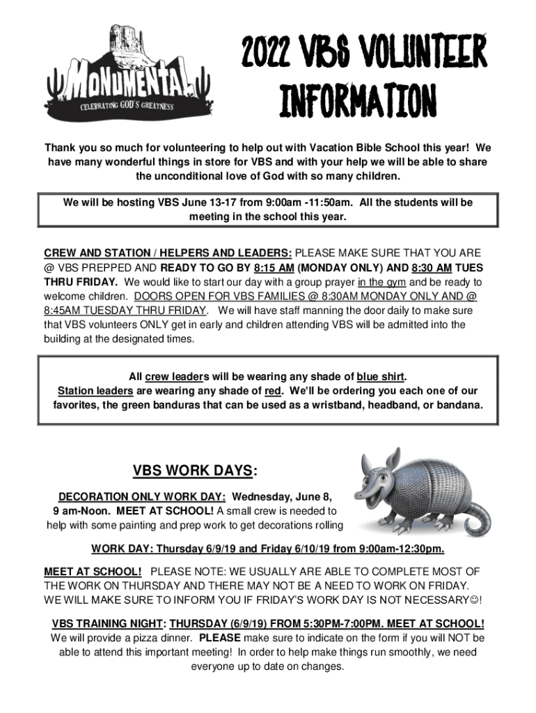 2022 VBS VOLUNTEER INFORMATION Thank you so much for volunteering to help out with Vacation Bible School this year! We have many wonderful things in store for VBS and with your help we will be able