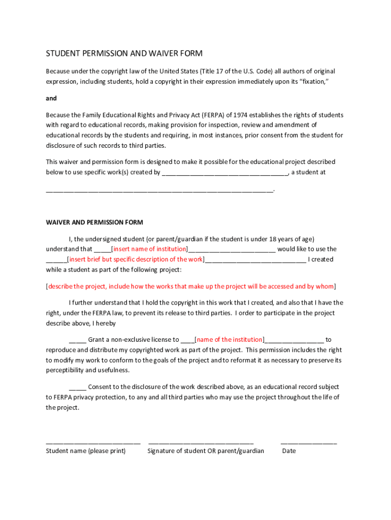 STUDENT PERMISSION AND WAIVER FORM Because under the copyright law of the United States (Title 17 of the U.S. Code) all authors of original expression, including students, hold a copyright in their