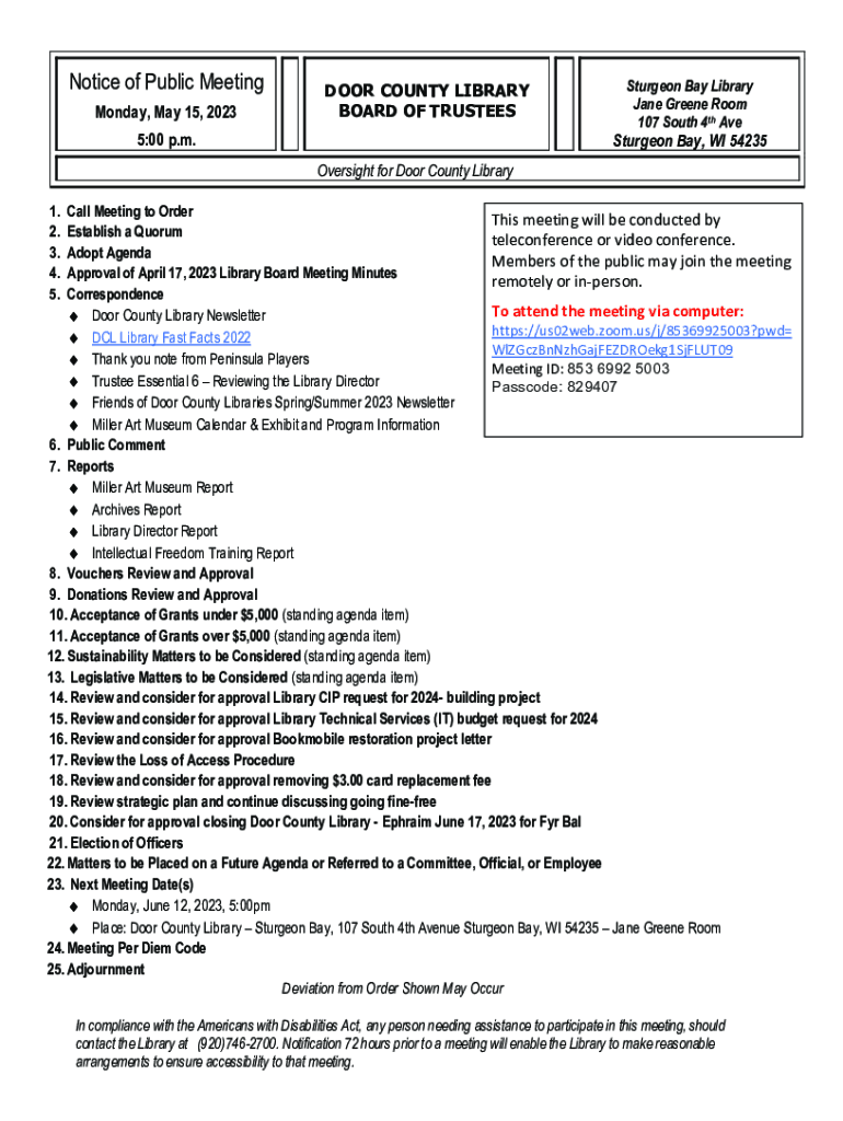 Notice of Public Meeting Monday, May 15, 2023DOOR COUNTY LIBRARY BOARD OF TRUSTEES5:00 p.m. Sturgeon Bay Library Jane Greene Room 107 South 4th Sturgeon Bay, WI 54235 Oversight for Door County Library1.