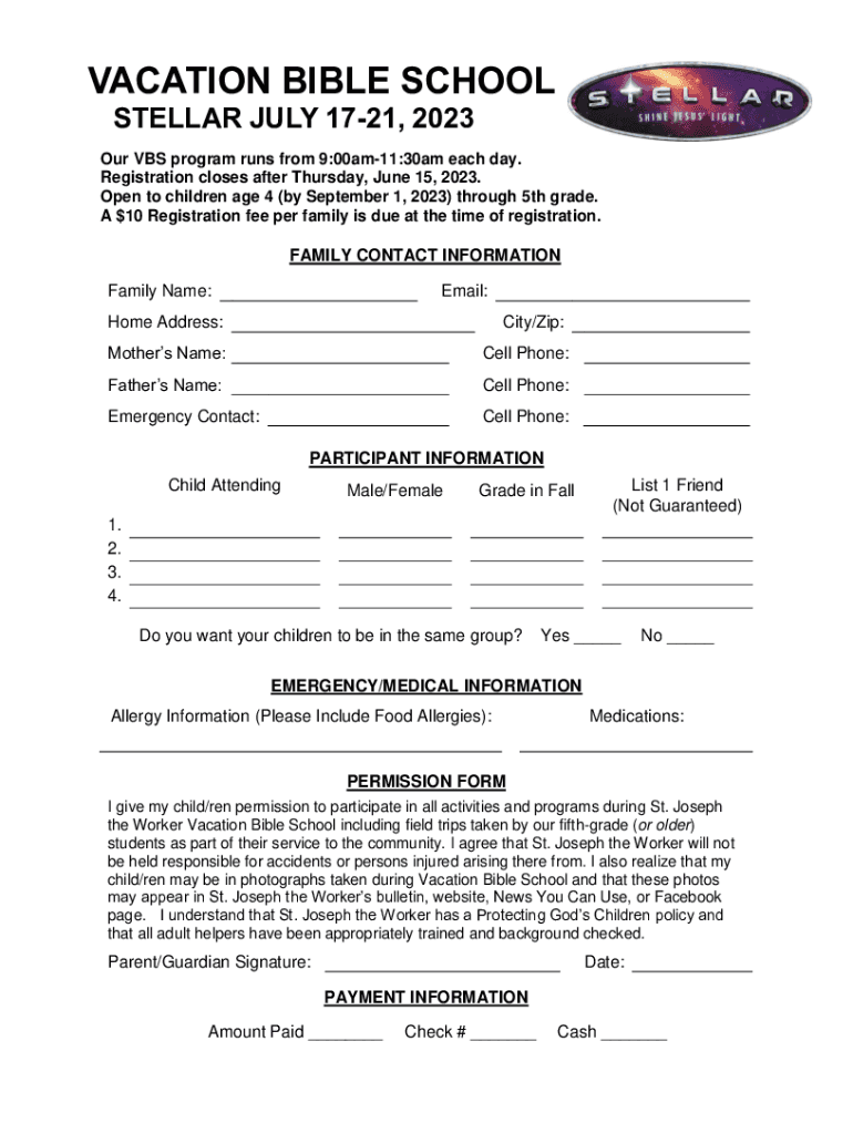 VACATION BIBLE SCHOOL STELLAR JULY 1721, 2023 Our VBS program runs from 9:00am11:30am each day. Registration closes after Thursday, June 15, 2023. Open to children age 4 (by September 1, 2023) through