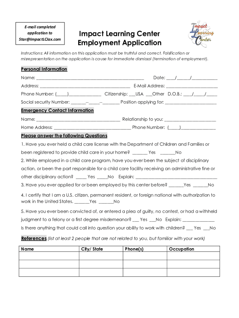 Email completed application to Star@ImpactLCJax.comImpact Learning Center Employment ApplicationInstructions: All information on this application must be truthful and correct. Falsification or misrepresentation