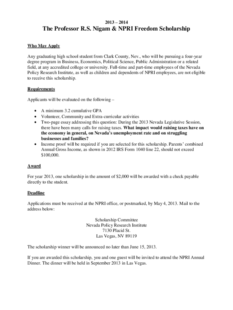 2013 2014The Professor R.S. Night & NPR Freedom Scholarship Who May Applies Any graduating from high school student from Clark County, Nev., who will be pursuing a Fourier degree program in Business,