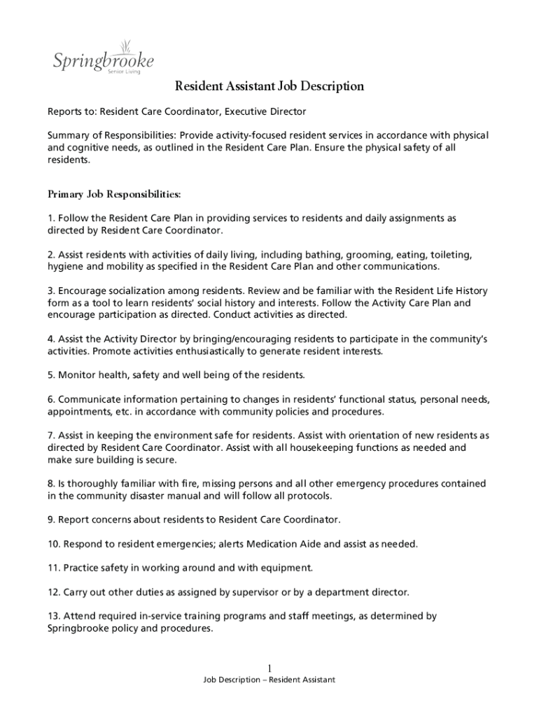 Resident Assistant Job Description Reports to: Resident Care Coordinator, Executive Director Summary of Responsibilities: Provide activity focused resident services in accordance with physical and
