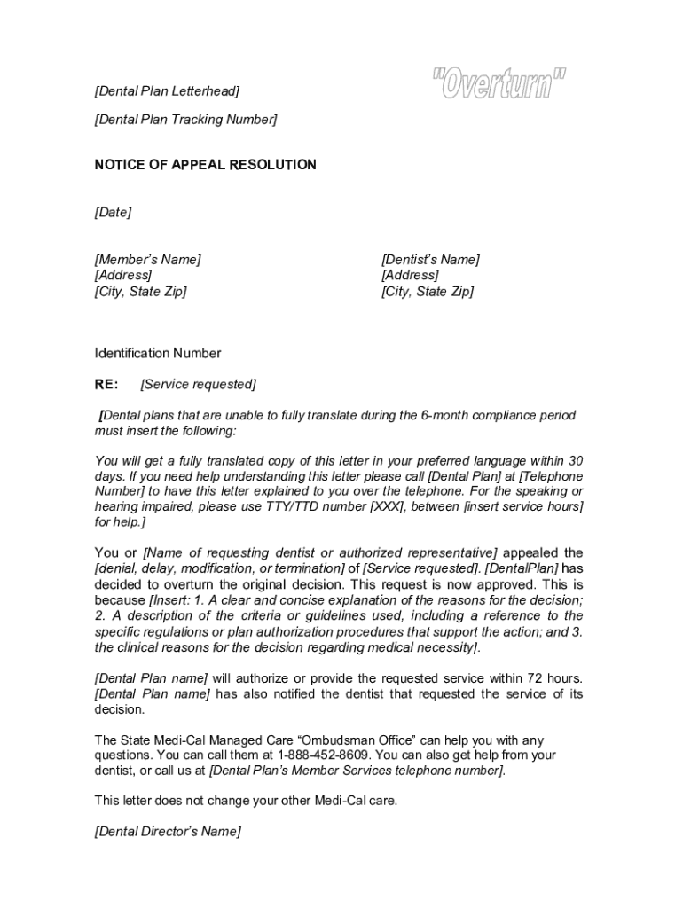 [Dental Plan Letterhead] [Dental Plan Tracking Number] NOTICE OF APPEAL RESOLUTION [Date] [Members Name] [Address] [City, State Zip][Dentists Name] [Address] [City, State Zip]Identification Number