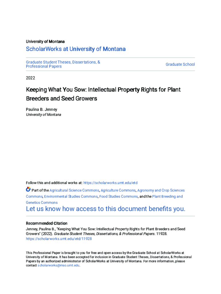 University of MontanaScholarWorks at University of Montana Graduate Student Theses, Dissertations, & Professional PapersGraduate School2022Keeping What You Sow: Intellectual Property Rights for Plant