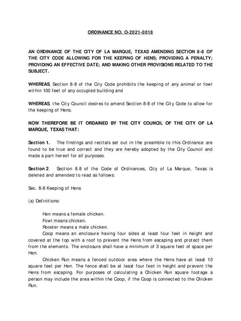 ORDINANCE NO. O20210018AN ORDINANCE OF THE CITY OF LA MARQUE, TEXAS AMENDING SECTION 88 OF THE CITY CODE ALLOWING FOR THE KEEPING OF HENS; PROVIDING A PENALTY; PROVIDING AN EFFECTIVE DATE; AND MAKING