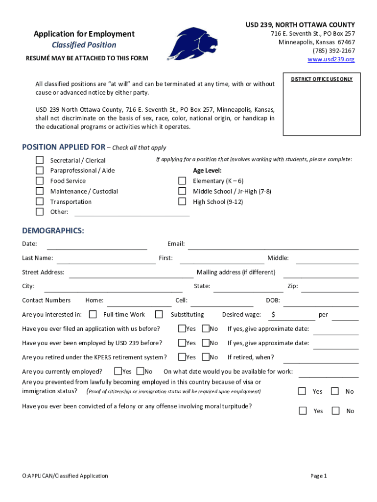 USD 239, NORTH OTTAWA COUNTYApplication for Employment