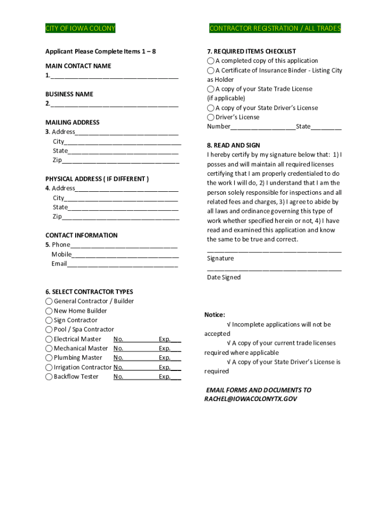 CITY OF IOWA COLONYCONTRACTOR REGISTRATION / ALL TRADESApplicant Please Complete Items 1 8 MAIN CONTACT NAME 1.___ BUSINESS NAME 2.___ MAILING ADDRESS 3. Address___ City___ State___ Zip___ PHYSICAL