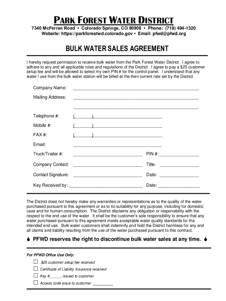 PARK FOREST WATER DISTRICT 7340 McFerrin Road Colorado Springs, CO 80908 Phone: (719) 4941320 Website: https://parkforestwd.colorado.gov Email: pfwd@pfwd.orgBULK WATER SALES AGREEMENT I hereby request