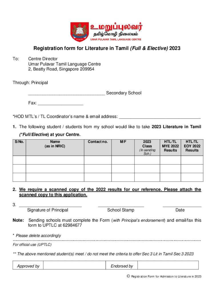 Registration form for Literature in Tamil (Full & Elective) 2023 To:Center Director Umar Planar Tamil Language Center 2, Beatty Road, Singapore 209954Through: Principal ___ Secondary School Fax: ___